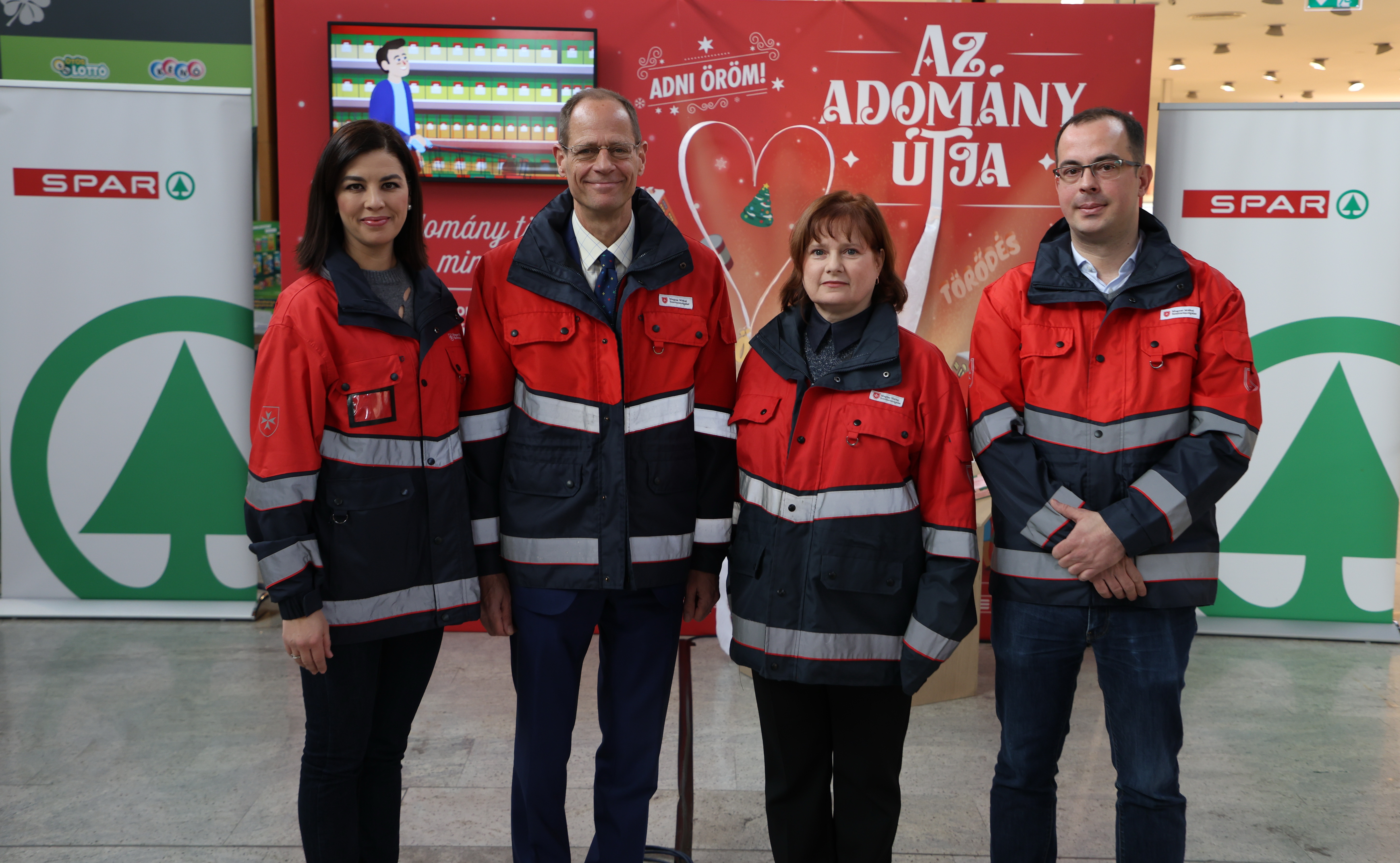 A csoportképen balról jobbra: Ördög Nóra, a SPAR jótékonysági nagykövete; Szabadhegy Péter, a Magyar Máltai Szeretetszolgálat elnöke; Heiszler Gabriella, a SPAR elnök-ügyvezető igazgatója és Maczelka Márk, a SPAR kommunikációs vezetője