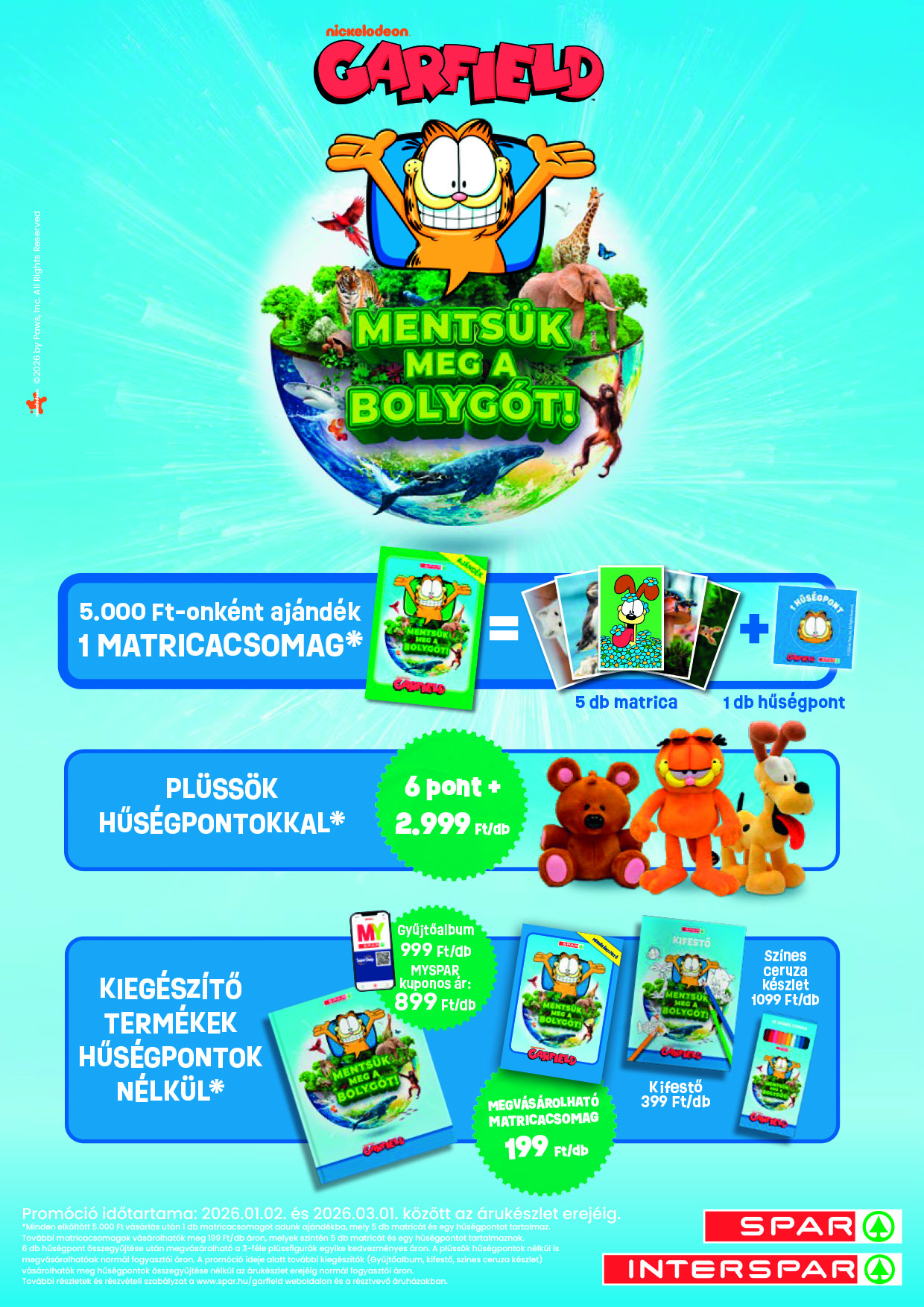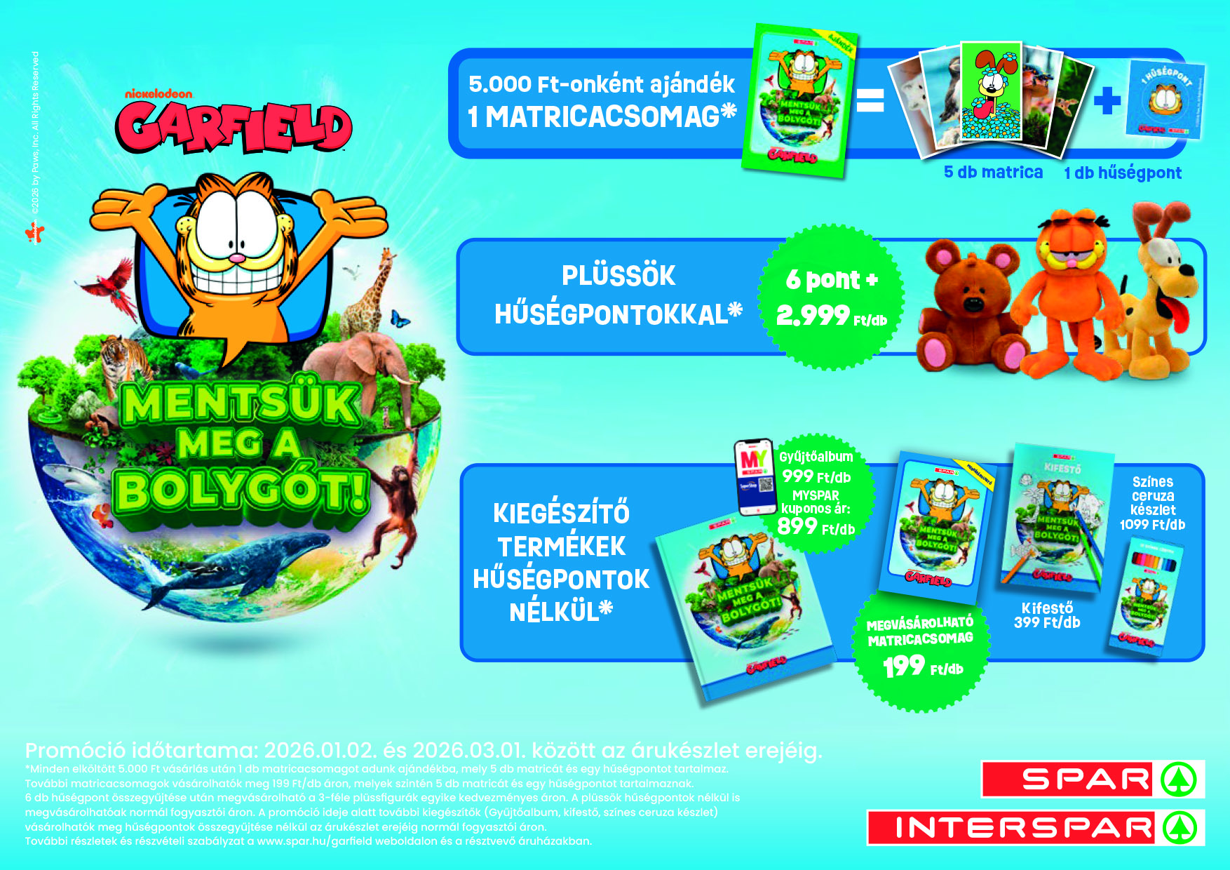 A hűségpromóció ugyanakkor nemcsak a matricák gyűjtéséről szól. A matricák mellett idén új Garfield-termékek is érkeznek, amelyek tovább erősítik az élményt: plüssfigurák, kifestő és színes ceruzakészlet is elérhető lesz az áruházakban. A háromféle plüss - Garfield, Ubul és Pooky - hűségpontok beváltásával kedvezményesen is megvásárolhatóak lesznek, míg a kísérőtermékek, vagyis a kifestő és a színes ceruzakészlet, hűségpontok összegyűjtése nélkül, normál áron vásárolhatók meg.