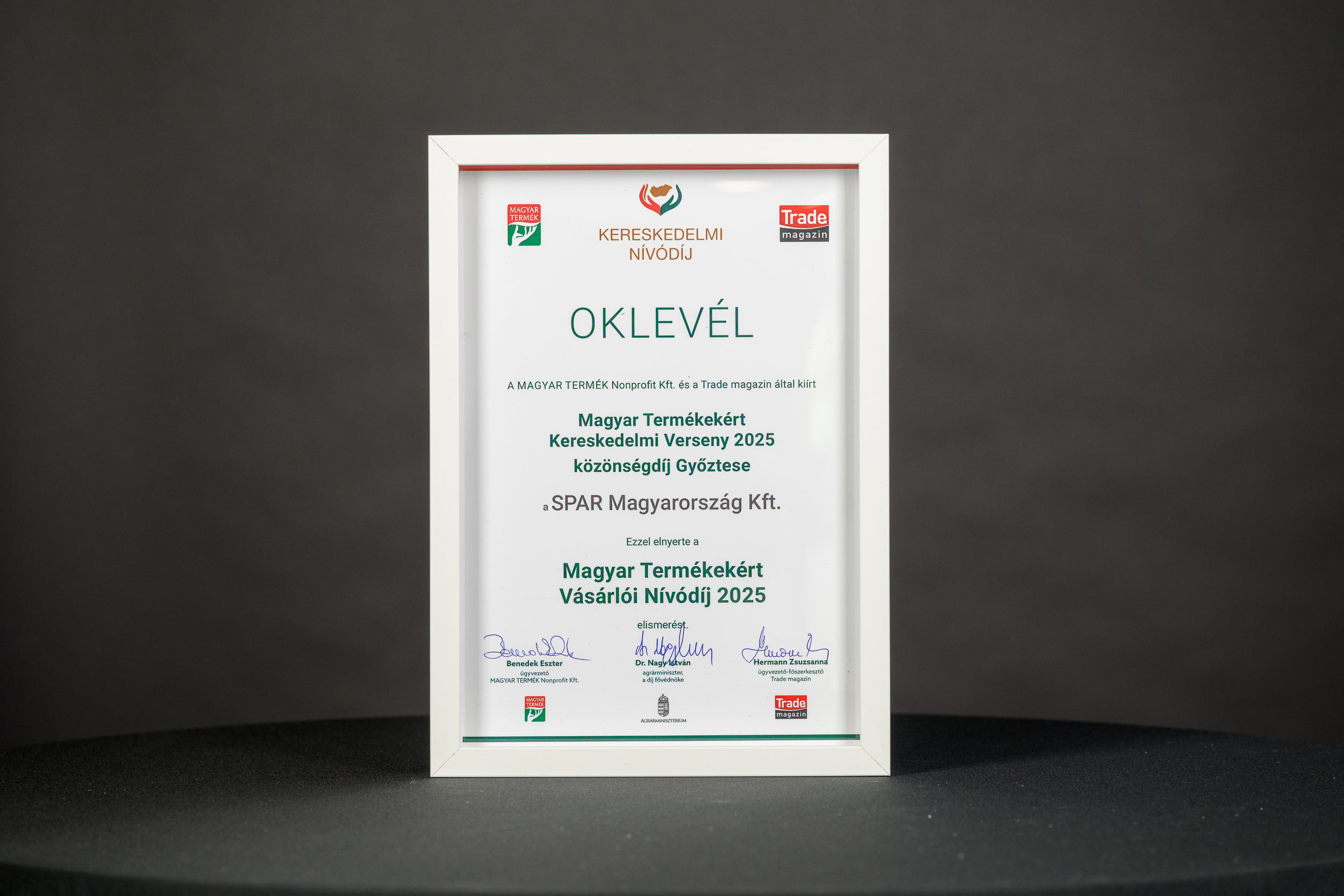 A SPAR Magyarország idén immár harmadszor nyerte el a fogyasztók szavazatai alapján odaítélt Vásárlói Nívódíjat, amely azt mutatja, hogy a vevők szerint az áruházláncban érhető el legkönnyebben a Magyar Termék védjegyes áruk széles kínálata. A szakmai zsűri értékelése alapján a vállalat a Magyar Termékekért Kereskedelmi Nívódíj bronzérmét is elnyerte, amely a magyar termékek forgalmazásában, kommunikációjában és támogatásában nyújtott kiemelkedő teljesítmény elismerése. Ez a kettős siker egyértelmű visszaigazolása annak, hogy a SPAR következetes és tudatos munkája a magyar termékek érdekében nemcsak a szakma, hanem a vásárlók körében is példaértékű.