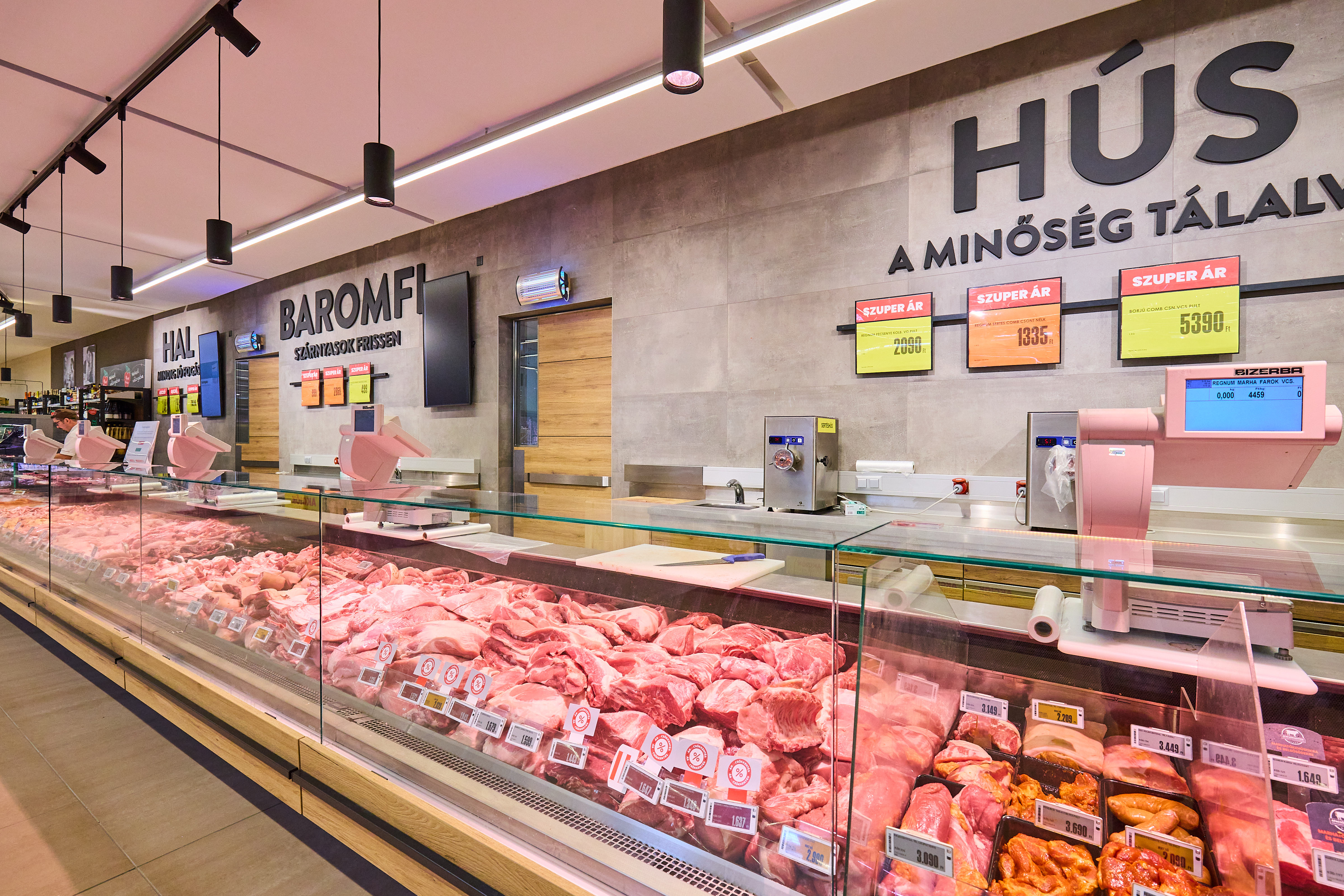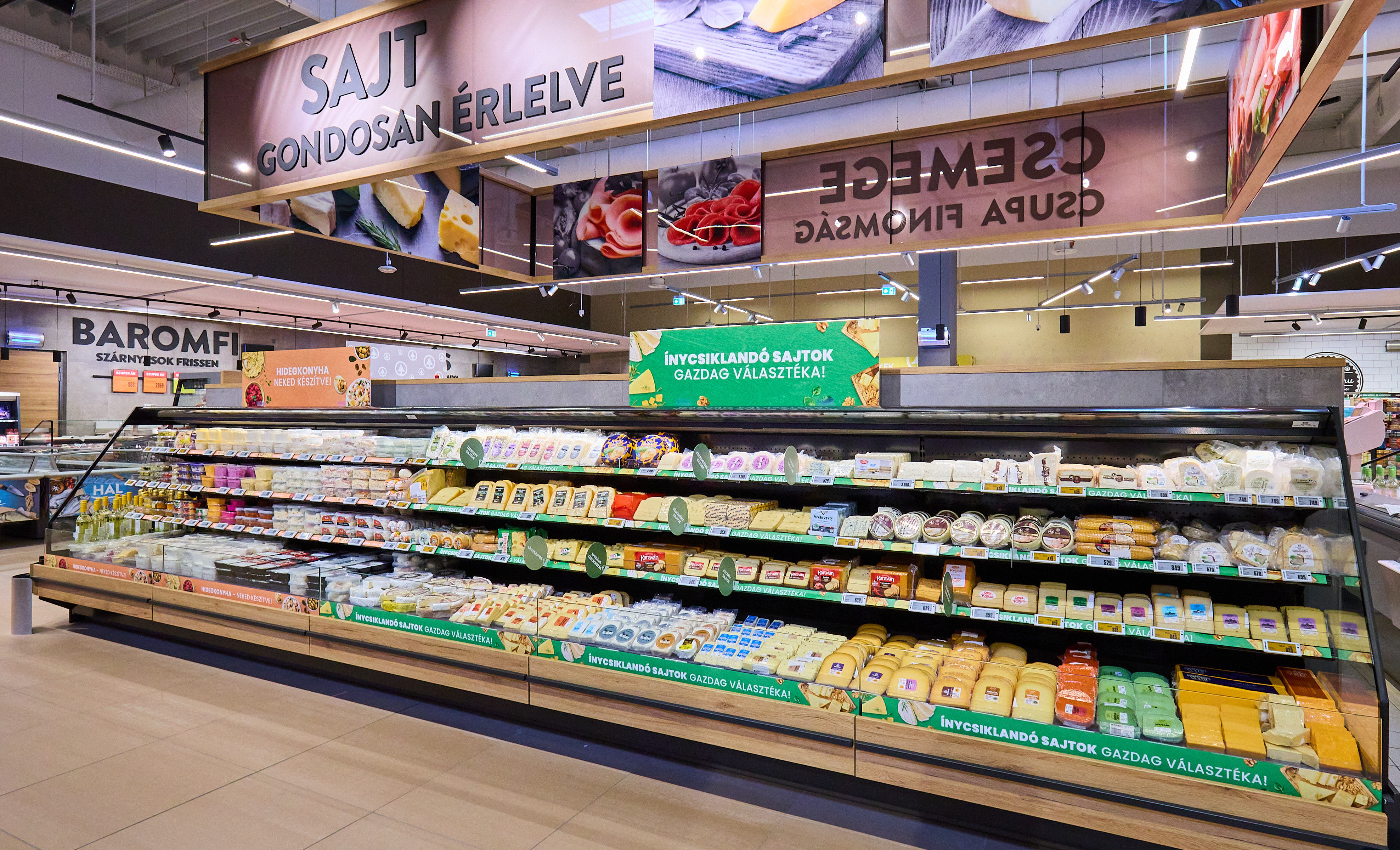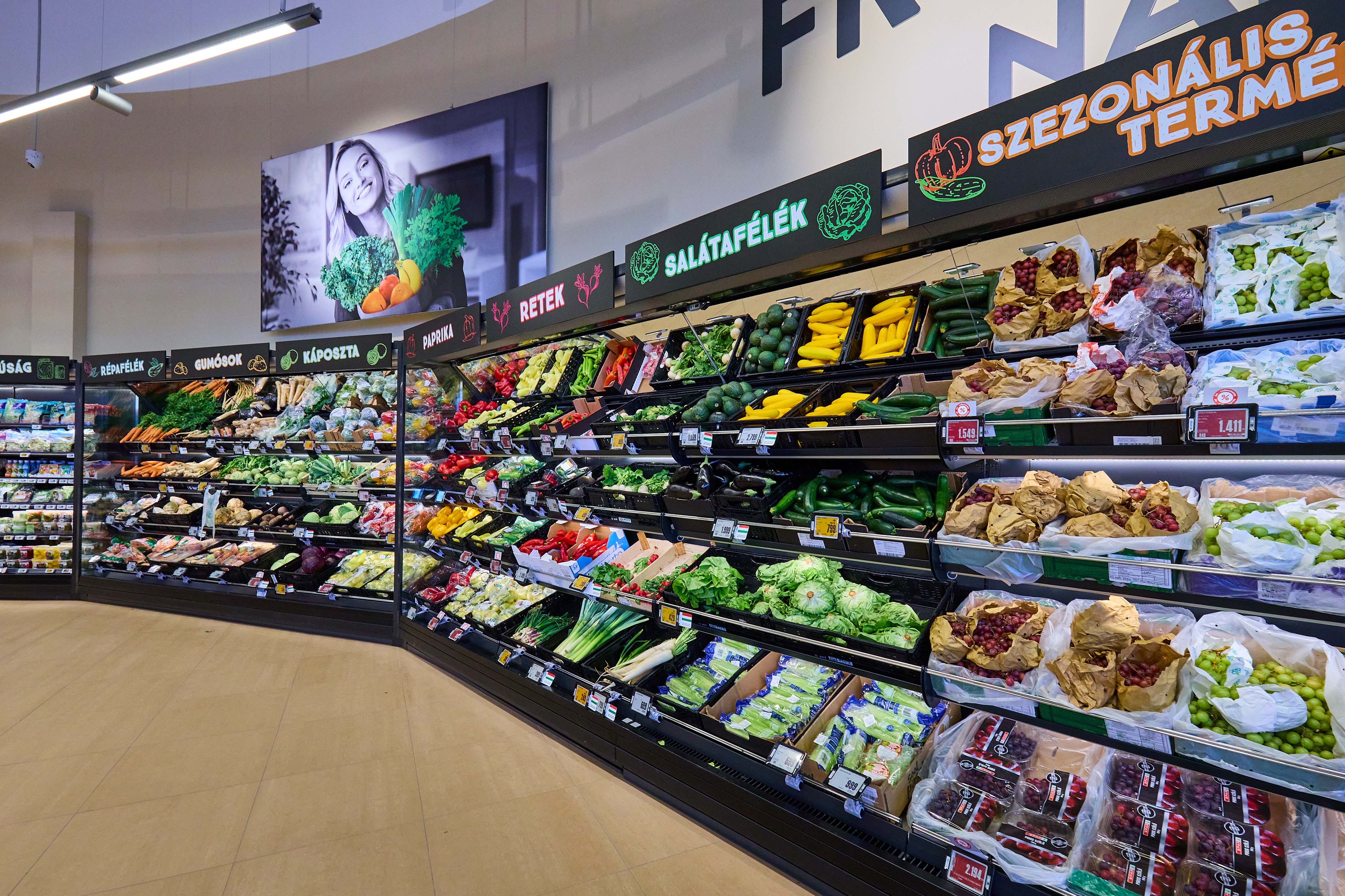 A vásárlókat a bejáratnál friss zöldség-gyümölcs kínálat és akciós ajánlatok fogadják, amelyeket a pékség, a csemegerészleg és a húspult követ, erősítve a friss piac jellegű elrendezést. A pék- és húsosztály teljesen megújult környezetben működik, a tej- és mirelit osztály, valamint a szárazáru területek szintén modernizált megjelenést kaptak. Több kiszolgáló területen - így a csemege- és húspultoknál - digitális kijelzők segítik a vásárlókat az aktuális árak és ajánlatok áttekintésében.